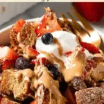 A delicious and comforting egg-free French toast casserole made with stale sourdough baguette cubes soaked in a flavorful mixture of almond milk, dairy-free yogurt, cinnamon, maple syrup, and flaxmeal, then topped with a crunchy almond topping and baked to golden perfection. Perfect for a cozy brunch or breakfast with fresh berries, peanut butter, and extra dairy-free yogurt.