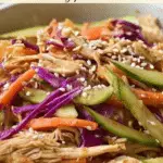 Finely shred the purple cabbage and carrot to ensure each bite has a perfect crunch. Thinly slice the Persian cucumbers and green onions, and cut the apple or Asian pear into matchstick-sized pieces to mimic the julienne style. Shred the cooked chicken breast halves so it integrates beautifully with the vegetables.
