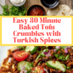This Turkish-inspired baked tofu crumble recipe delivers a flavorful and protein-packed plant-based dish perfect for a quick and easy meal. The tofu is grated and mixed with aromatic spices such as cumin, paprika, cinnamon, and allspice, then baked to create a savory crumble that mimics the texture of ground meat. Served with a tangy non-dairy yogurt sauce and fresh vegetables in pita bread, it’s a delicious and healthy option for lunch or dinner.