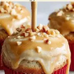 Spread a thin layer of the warm caramel sauce over each cooled cupcake, taking care to avoid smearing caramel onto the paper liners which can cause sticking. Immediately sprinkle chopped pecans on top, pressing lightly so they adhere well. Insert one wooden craft stick into each cupcake’s center to mimic the classic caramel apple presentation and add an interactive element that’s perfect for parties or gifting.