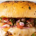 These Chicken Burgers with Bang-Bang Sauce deliver a flavorful twist on classic chicken patties. Juicy ground chicken mixed with bold spices and topped with melted Swiss cheese pairs perfectly with a fresh tomato-cilantro salsa and a creamy, spicy Bang-Bang Sauce. Grilled to perfection on a cast iron pan and served on toasted onion buns with crisp Romaine lettuce, these burgers offer a delicious and satisfying meal that’s easy to prepare.