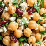 A vibrant and refreshing Feta and Cranberry Chickpeas salad combining protein-packed chickpeas with tangy feta, sweet dried cranberries, crunchy nuts, and fresh herbs, all tossed in a light apple cider vinaigrette. This no-cook salad is perfect for a quick, nutritious meal or side dish.