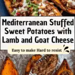 - Assemble the Stuffed Sweet Potatoes: Once the sweet potatoes are roasted and cool enough to handle, carefully scoop out a small portion of the flesh from each half to create a cavity for the filling. Spoon the lamb mixture generously into each sweet potato half. Top with crumbled goat cheese, toasted pine nuts, and chopped fresh mint.