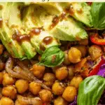 Remove the skillet from the heat and let the mixture cool just slightly. Stir in the red wine vinegar, chili powder, cumin, and vegan sugar to create a tangy, balanced dressing. Pour this flavorful vegetable mixture into the bowl with the spiced chickpeas, scraping the skillet to get all the spices and oils. Finally, add the chopped red cabbage, cilantro, basil leaves, and fresh lemon juice, tossing everything together gently but thoroughly. You can serve this salad warm for a comforting dish or chilled for a refreshing, cool bite.