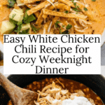 Serve this White Chicken Chili Recipe in a hollowed-out bread bowl for a rustic and inviting presentation. For a casual gathering, offer an array of toppings in small bowls so guests can build their perfect bowl. You can even ladle it over baked potatoes or nachos to give it a playful twist.